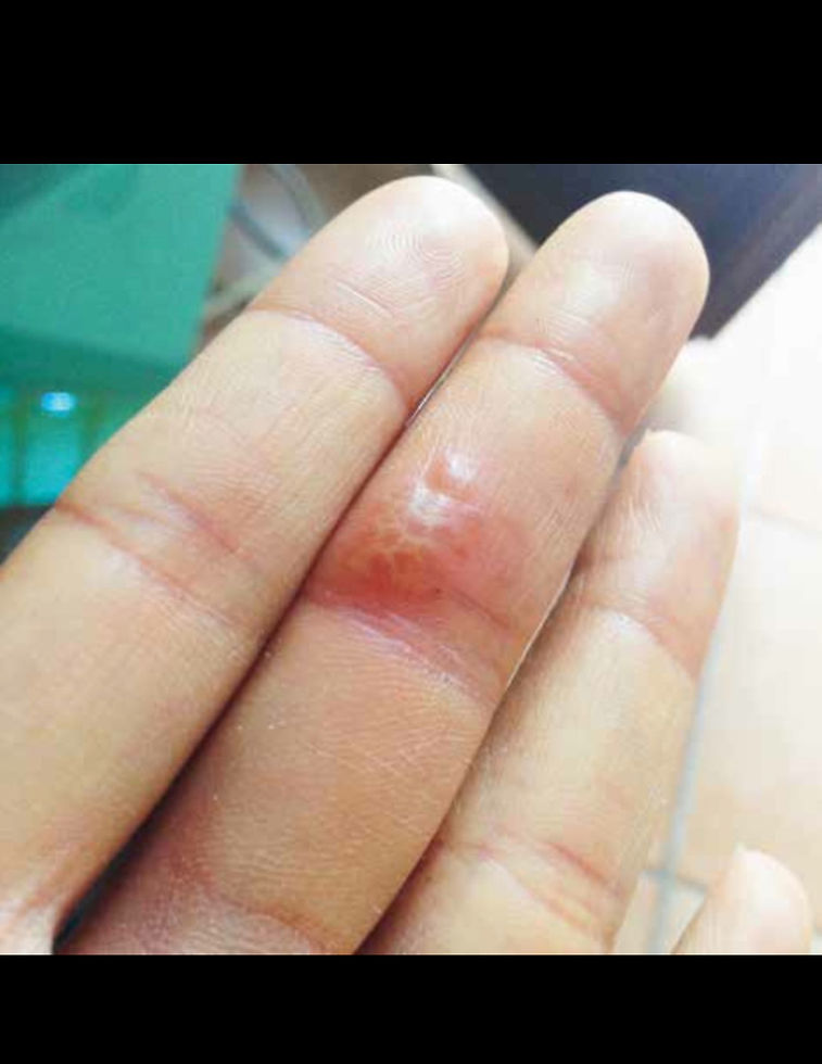 Um residente de odontologia de 25 anos procura o pronto-socorro relatando dor intensa, edema e aparecimento de vesículas agrupadas eritematosas no segundo dedo da mão direita, com evolução de 3 dias. Ele refere que recentemente atendeu pacientes com lesões orais ulceradas. Nega febre ou sinais sistêmicos.