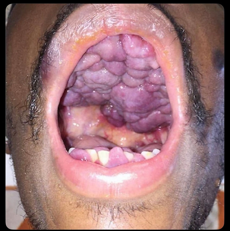 A imagem mostra lesões múltiplas, arredondadas, translúcidas, lembrando “ovos de rã” ou aspecto em “cobblestone”, achados clássicos de linfangioma oral — uma malformação benigna dos vasos linfáticos que frequentemente acomete língua e palato.