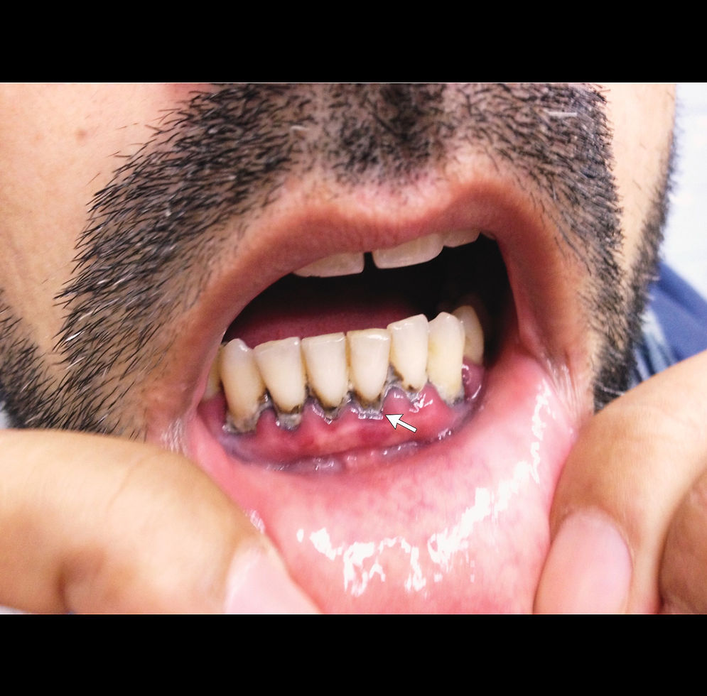 Homem de 34 anos, trabalhador da indústria de baterias automotivas, procura atendimento por queixas de dor abdominal difusa em cólica há 3 meses, constipação frequente e fadiga intensa. Refere irritabilidade, cefaleia recorrente e episódios de fraqueza em mãos, dificultando o movimento de extensão dos punhos. Ao exame físico, observa-se linha azulada enegrecida na margem gengival (linha de Burton) (vide imagem).
