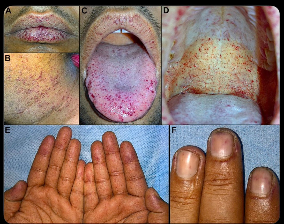 Jovem de 19 anos com epistaxes recorrentes e telangiectasias em lábios, língua, face e polpas digitais.